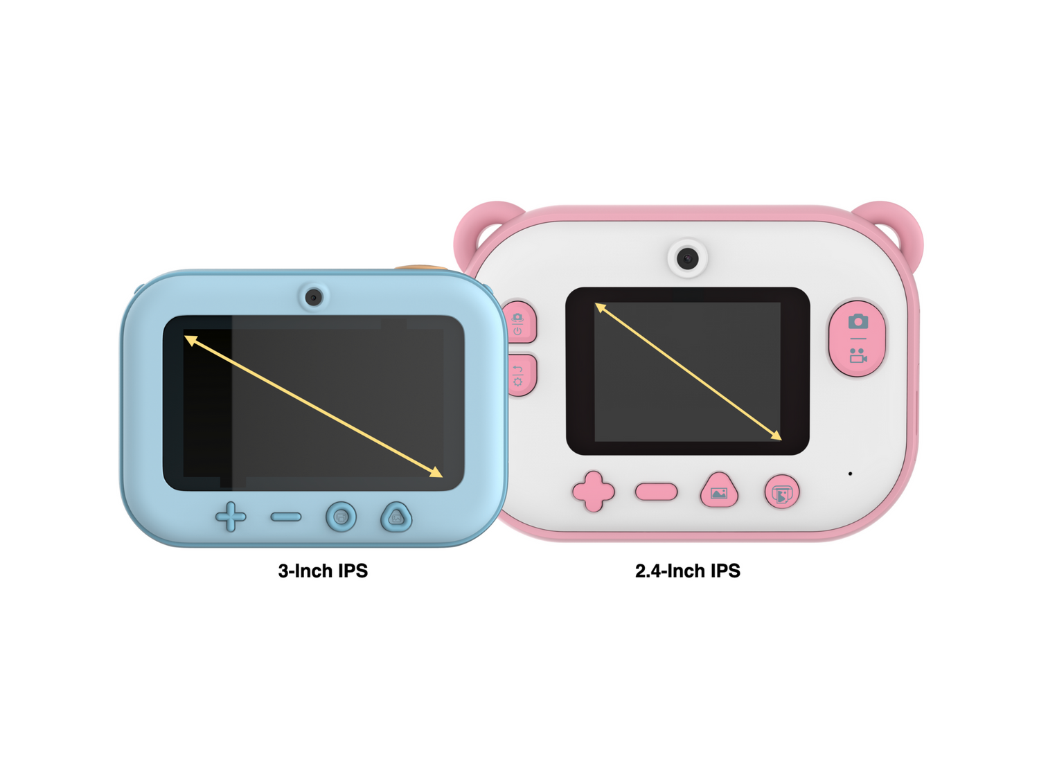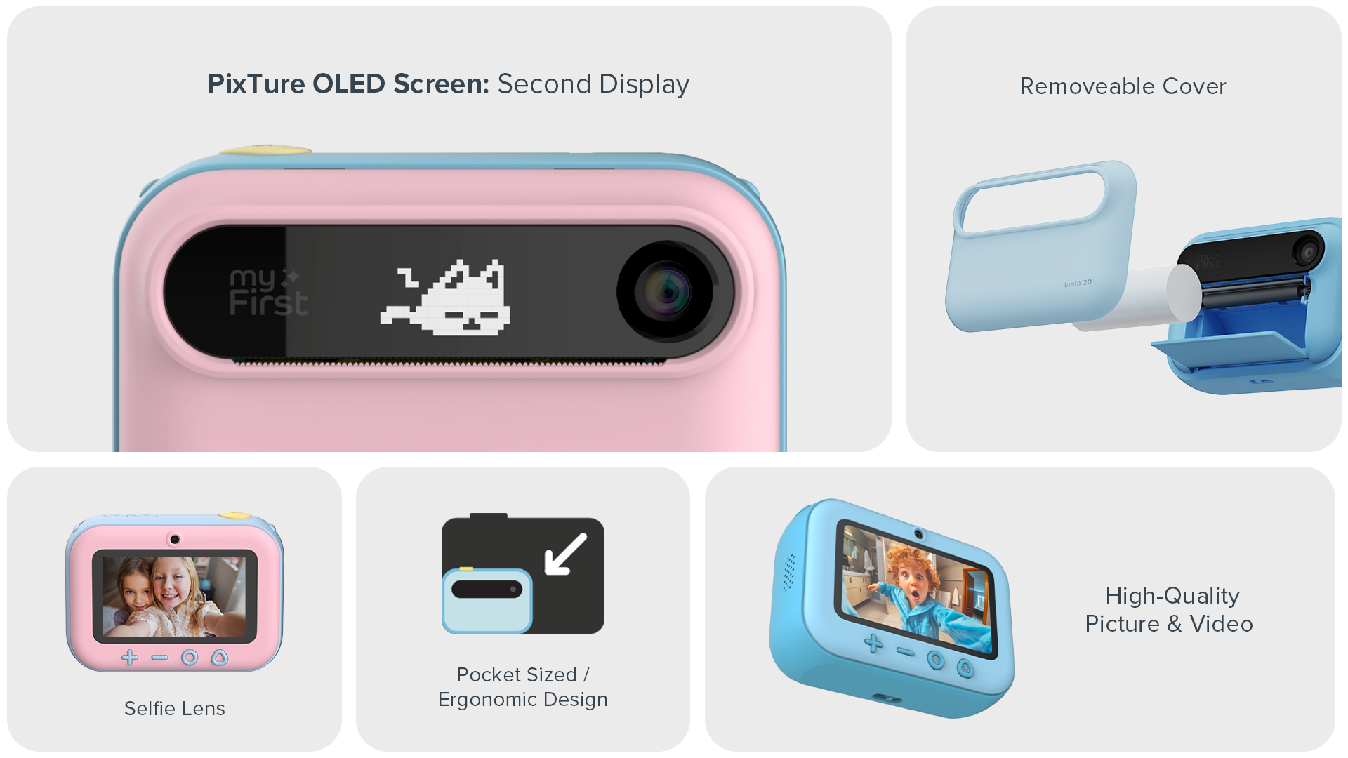 يتميز تصميم الشاشة المزدوجة بشاشة ملونة IPS بحجم 3.0 بوصة وشاشة أمامية OLED تعرض رسومًا تفاعلية بأسلوب البيكسل، وإيموجي، وعدّ تنازلي. هذا يجعل تجربة التصوير أكثر تفاعلًا ومتعة للمستخدمين الصغار.